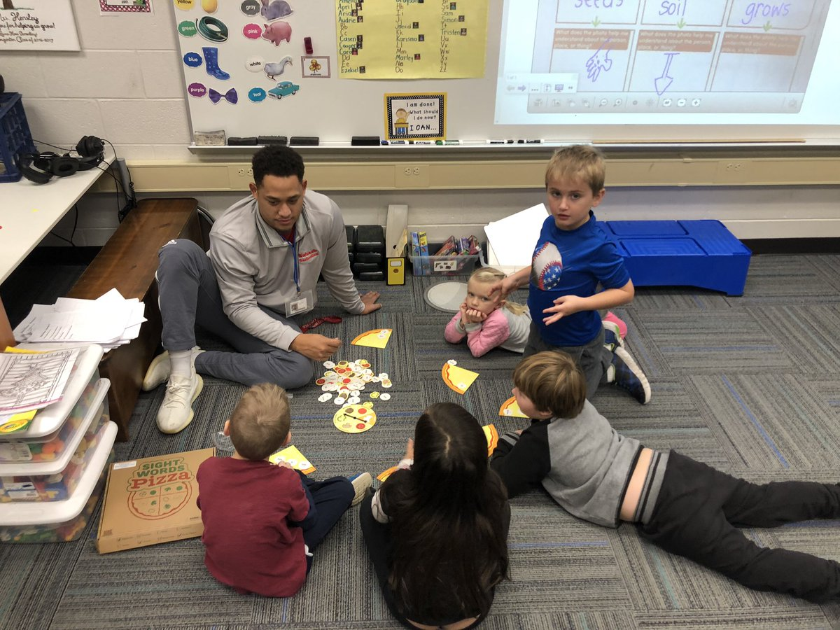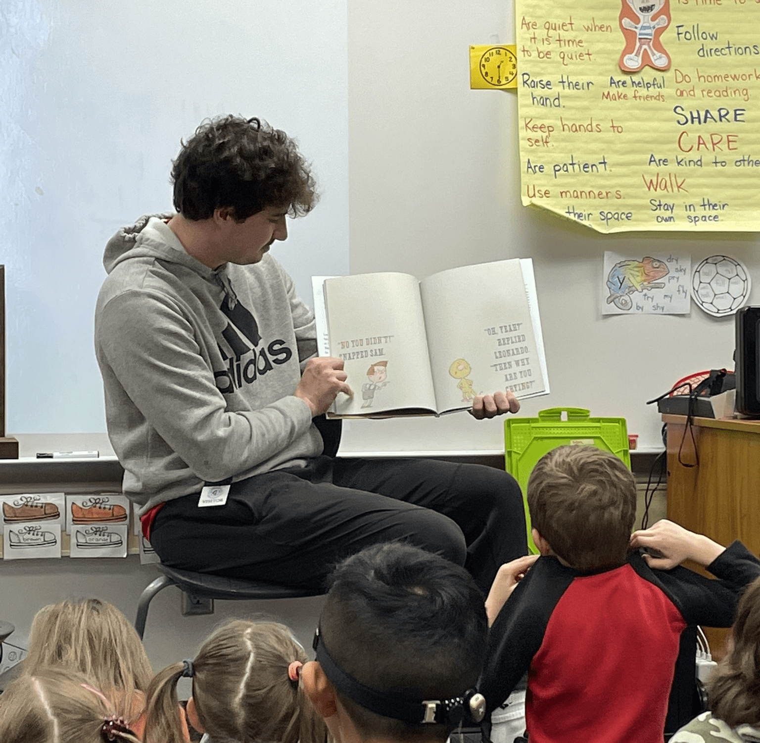 Members of the Wabash basketball team reading and spending time with kindergardners and first graders at Rohr Elementary School in Crawfordsville, Ind.