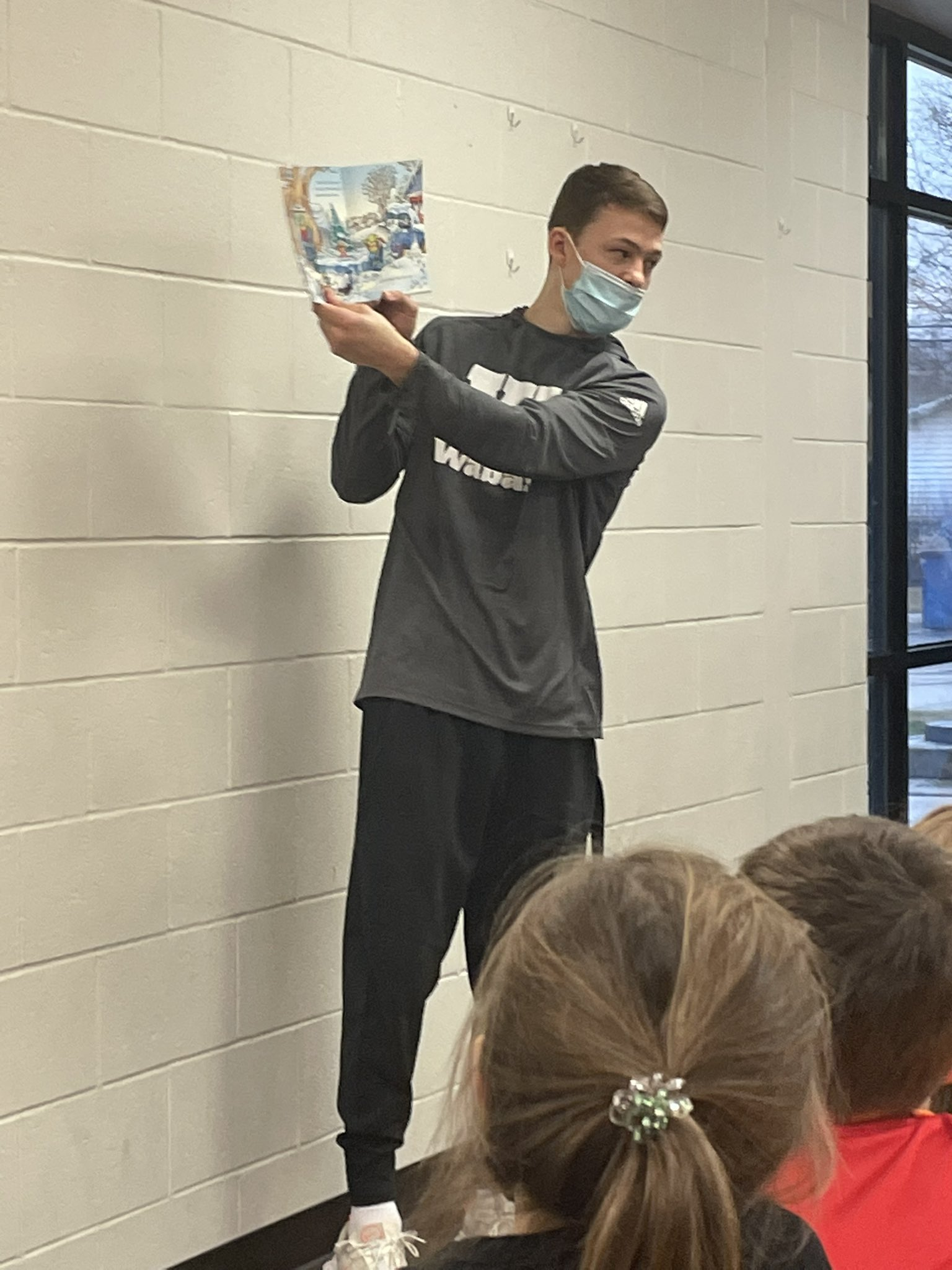 At Left: Hose Elementary students hold up signs encouraging the Wabash Little Giants. At Right: Senior Kellen Schreiber reading to students at Hose on March 7.
