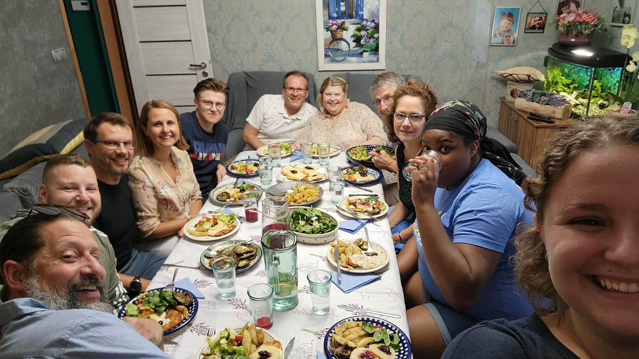 The team then traveled about 30 miles southwest of Warsaw to Zyardow. It spent Monday evening meeting with Pastor Adam Grzywaczewski and his wife Gosia from Kościół Chrześcijan Baptystów. The Mission Team and the Grzywaczewskis had dinner on Monday with Kristoff and Aliscia and their family, also members of Kościół Chrześcijan. The Team’s main mission: Helping serve Ukrainian refugees in Poland.