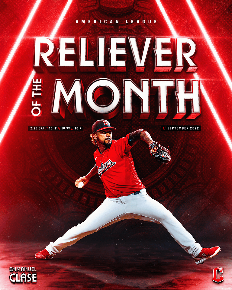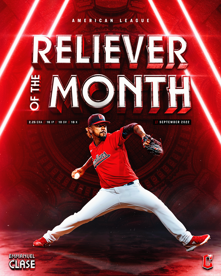 A four-time AL Reliever of the Month this season, Clase leads all of baseball with 41 saves. He’s pitched in 76 games, with a 3-4 record, an ERA of just 1.38, and an infinitesimal 0.73 WHIP.