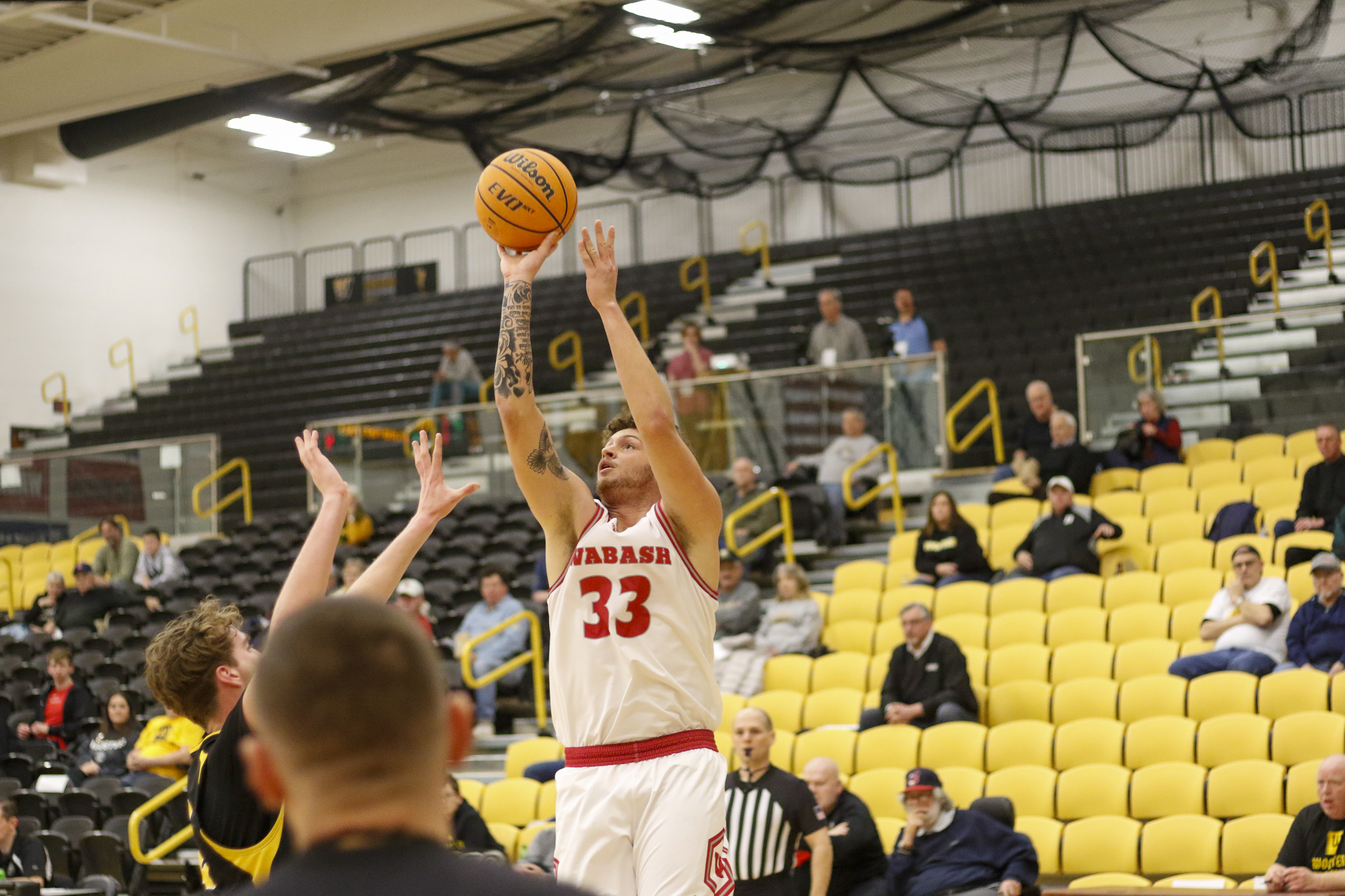 This time it was Wabash starting quickly out of the gate. Red-hot offensively, the visitors hit on 6 of 7 field goals, including 5-5 from beyond the three-point arc, to take an early 12-point lead at the 16:11 mark in the first half. Freshman center Gavin Schippert led the way, scoring 17 points early. The Little Giants extended their advantage to 17 (34—17) on an Edreece Redmond 3-pointer with 8:24 in the first.