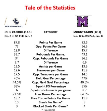 Both also come into this contest with high rankings in the current NCAA Division III men’s basketball poll. John Carroll, once No. 1, sits at No. 8 in the January 8 poll. Mount Union is at No. 12, although perhaps it deserves a higher spot.