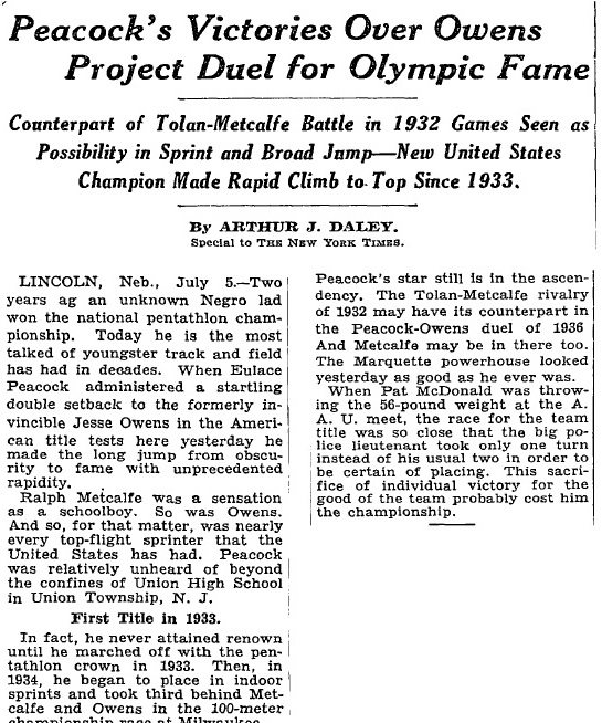 Anyone interested in knowing more about the rivalry between Owens and Peacock should read Michael McKnight’s terrific 2016 account “Faster than Fastest” on Sports Illustrated‘s website. The link is https://www.si.com/longform/peacock/index.html