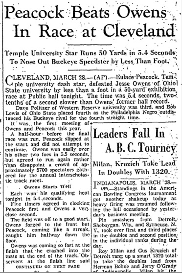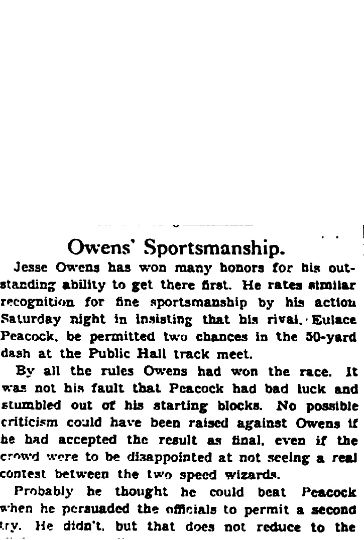 Among its commentary on national and international problems, the Cleveland Plain Dealer devoted an editorial to what Owens did in its March 30 paper. Headlined “Owens’ Sportsmanship,” it began like this: “Jesse Owens has won many honors for his outstanding ability to get there first. He rates similar recognition for fine sportsmanship by his action Saturday night in insisting that his rival, Eulace Peacock, be permitted two chances in the 50-yard dash at the Public Hall track meet…” The last sentence read, “This colored youth from Cleveland’s East End rates a salute from all who honor fine sportsmanship.” (NOTE: Sadly, such racial connotations were common in this era of journalism in the U.S.)