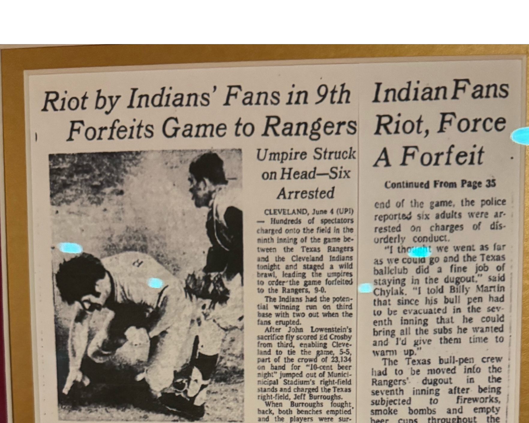 Newspaper accounts from the next day State that in the ninth inning, a fan ran out on the field and tried to take the baseball cap from Jeff Burroughs of the Texas Rangers. Burroughs fell down during the incident and the Texas Rangers believed he was attacked and emptied their bench. That’s when all hell broke loose! Hundreds of fans poured onto the field and it was impossible to complete the game. Apparently, there have only been five baseball games forfeited since 1954 and this was one of them as we did forfeit the game!