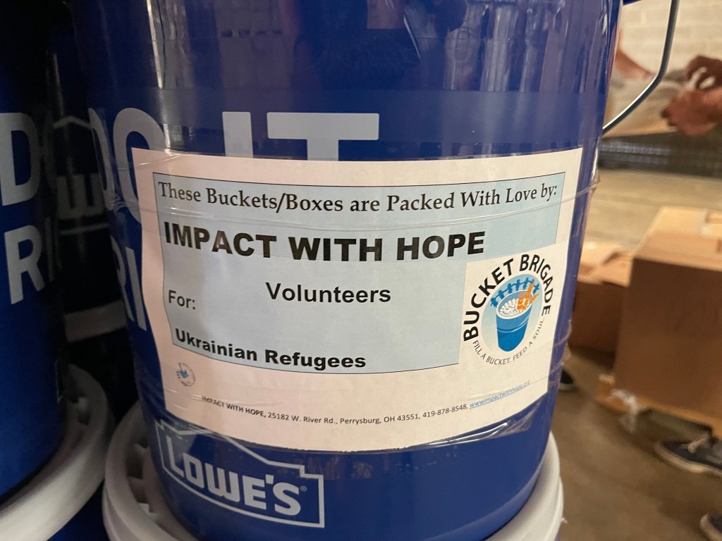 The Toledo area charity Impact With Hope has donated thousands of white and blue five-gallon buckets filled with food and medical relief supplies (one of the buckets is pictured above). Southwest General Medical Center donated 40 medical beds which have found their way to hospitals still operating in Ukraine, and a hospital in Michigan provided additional medical equipment. Akron-based Jennings Heating & Cooling also donated two 25Kw generators, which are being used to power medical equipment donated from the U.S. to Ukrainian hospitals.
