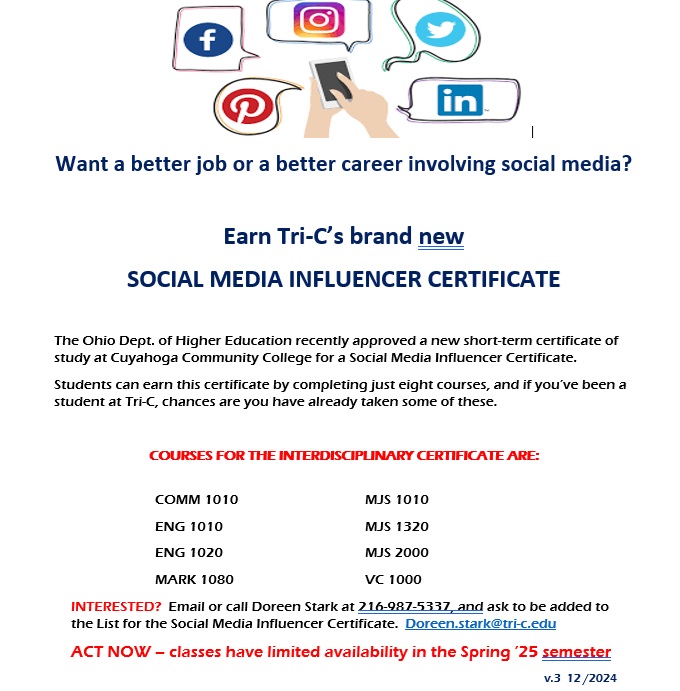 Additionally, the Ohio Department of Higher Education has approved Tri-C offering a Certificate of Study to earn a certificate as a Social Media Influencer. This is an interdisciplinary course of study which includes courses in Visual Communications, Marketing, Communication Studies, and MJS. If you take just six course (plus two English courses), you gain the Social Media Influencer certificate.