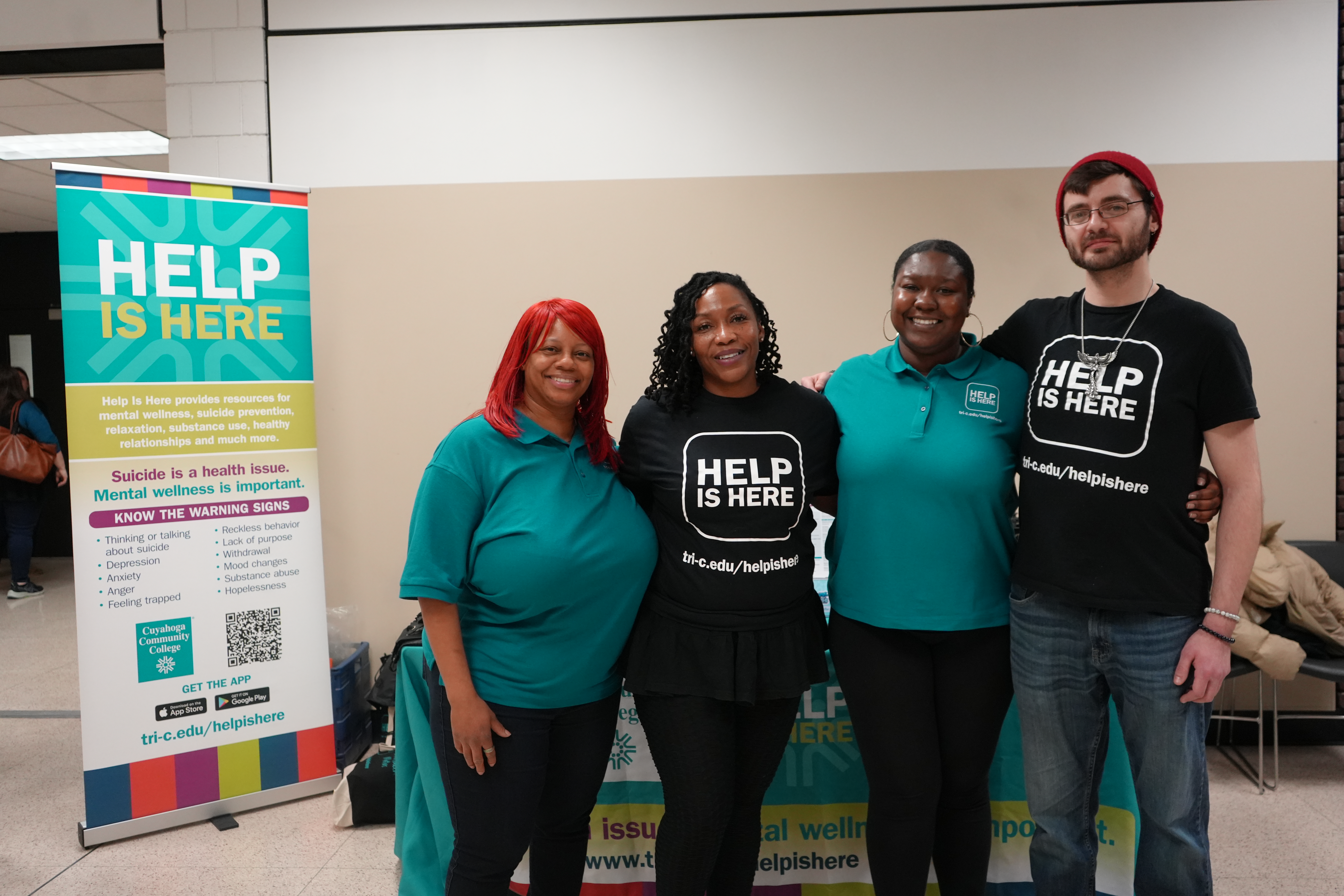 Tri-C students Rashiadah Weaver, Stefanie Wims, Tamika Edwards and Thomas Bemak are Peer Influencers who work on projects and attend events to help promote the HIH website and app. The Influencers were instrumental ensuring that there is a QR Code and written information about mental health, so that all persons in the community could have access to HIH.