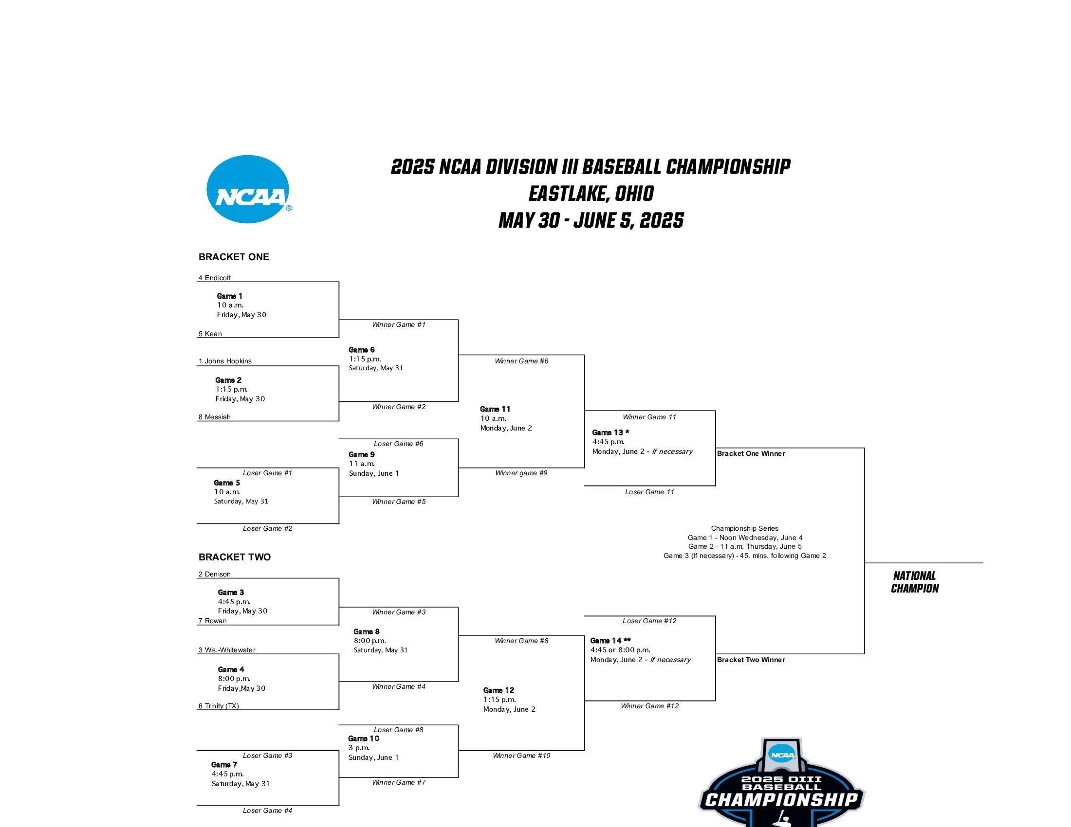EASTLAKE, MAY 30 – Fans of small college baseball are flocking to Northeast Ohio to follow their favorite team in the NCAA Division III championship series, which begins at 10 a.m. with No. 4-ranked Endicott College opposing No. 5 Kean University. (The entire tournament bracket is below.) Also on the field today will be No. 8 Messiah vs. No. 1 John Hopkins, No. 7 Rowan vs. No. 2 Denison U, and No. 3 Univ. of Wisconsin-Whitewater against No. 6 Trinity (TX). All games will be played at the Lake County Captains’ Classic Auto Group Park in Eastlake. (See below.)