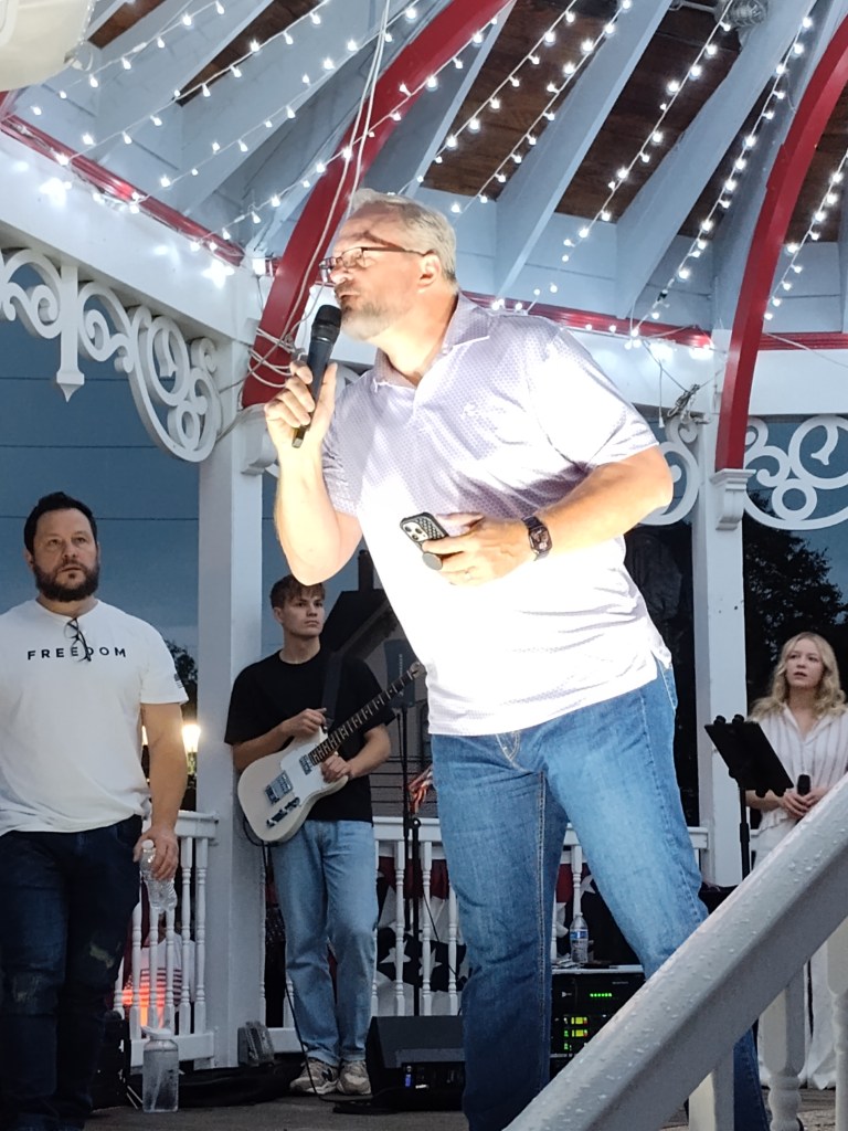 Mayor Perciak asked for prayers for Erika Kirk and the couple’s two young children. “God give them the strength and energy to move forward,” he added. “God is good ….” he continued, and the crowd responded in unison with the mayor, “all the time.”