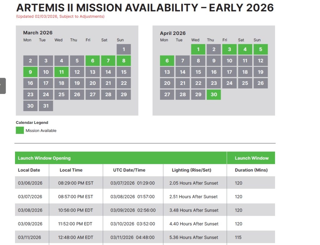 QUICK NOTE: Following NASA Kennedy Space Center’s success yesterday with the Wet Dress Rehearsal for Artemis II, NASA is expected to announce soon that it will aim for the March “launch window” for the moon shot This means launch could happen as soon as Friday, March 6, or two weeks from now. See the launch window below.